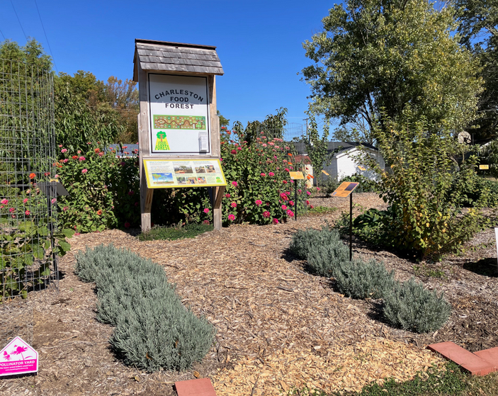 The Cultivated with Care perennial food forest at 825 18th Street, Charleston, IL provides the community with an educational demonstration of how a food forest works while at the same time helping to relieve poverty by offering the food grown there to those in need and promoting social welfare by helping to improve local food security. Visitors are encouraged to help with harvesting so that they can try a particular food and determine whether they could grow it at home. The overall message is one of food security.